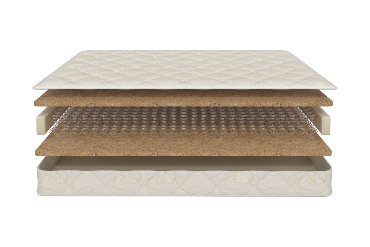 Состав: натуральный хлопковый чехол, стеганый на полиэфирном волокне; кокосовая плита; пружинный блок «Bonnel» h-7 см. Усиление по периметру.